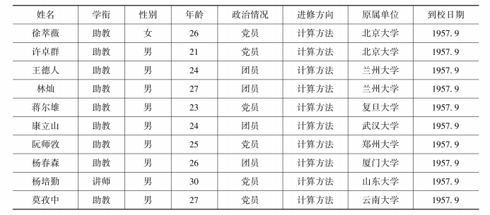 面向全国组织了计算数学师资培训班。1957年9月,北京大学、兰州大学、复旦大学、武汉大学、郑州大学、厦门大学、山东大学、云南大学(表3)派出青年教师前来进修。特别需要注意的是,北京大学也派人来参加,这与禁漫天堂